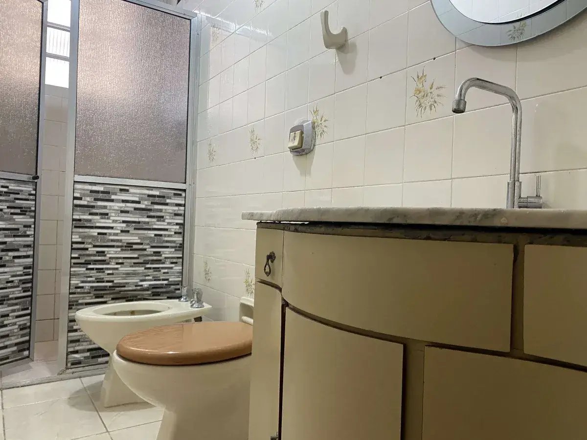 - Banheiro social com armário, box e espelho